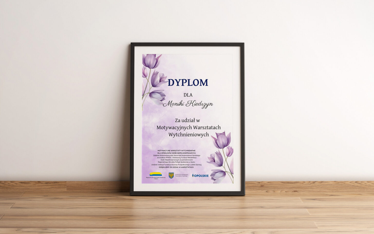 Projekt Dyplomu został zrealizowany w Zakładzie Aktywności Zawodowej w Kluczborku (ZAZ Kluczbork) jako część wewnętrznych działań. Moja rola polegała na zaprojektowaniu oficjalnego dokumentu pamiątkowego z okazji zakończenia Motywacyjnych Warsztatów Wytchnieniowych. Głównym celem było stworzenie grafiki, która byłaby jednocześnie uroczysta i estetycznie kojąca, odzwierciedlając charakter i misję wydarzenia.